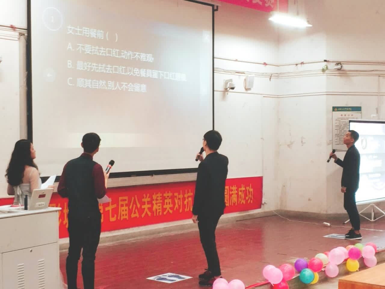 为演绎公关梦想,传递精英魅力,给同学们提供展示自我、互相交流的平台,校公关协会于5月20日下午2:30在二教报告厅举办了第七届公关精英对抗赛决赛。比赛由来自管理工程学院的汪磊、赵静云、赵恒梅三位老师担任评委。