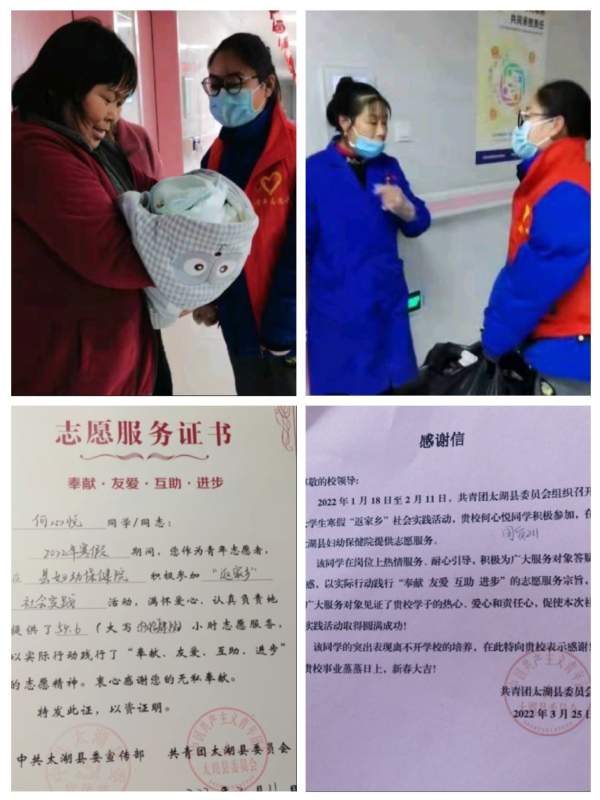 2022年1月18日至2月11日,共青团太湖县委员会组织开展大学生寒假“返家乡”社会实践活动,经济与管理学院国贸211的何心悦同学积极参加活动,在安庆市太湖县妇幼保健院提供志愿服务,得到太湖县妇幼保健站的高度肯定和赞扬。