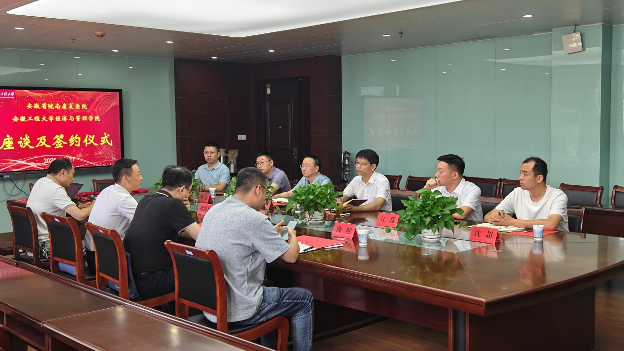 6月27日,经济与管理学院与安徽省皖南康复医院合作签约仪式在学院C座818会议室举行。安徽省皖南康复医院党委委员、副院长胡剑辉,科教部、信息科、病案管理负责人,经济与管理学院党委书记水心宝,院长龚本刚,学院大数据管理与应用专业相关老师参加了签约仪式。仪式由数字经济与产业发展研究所所长汪磊主持。