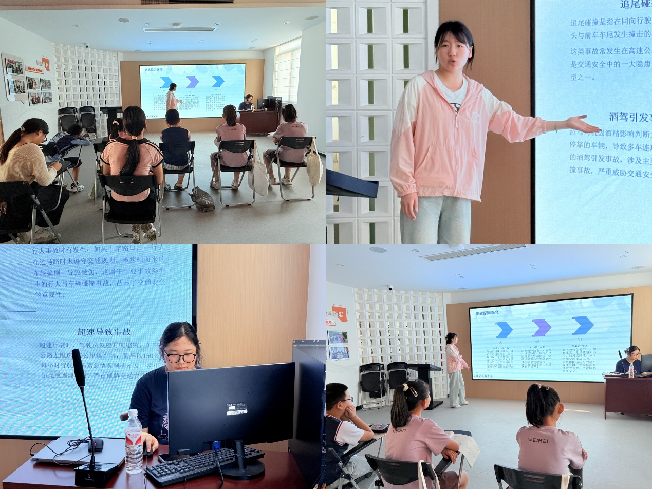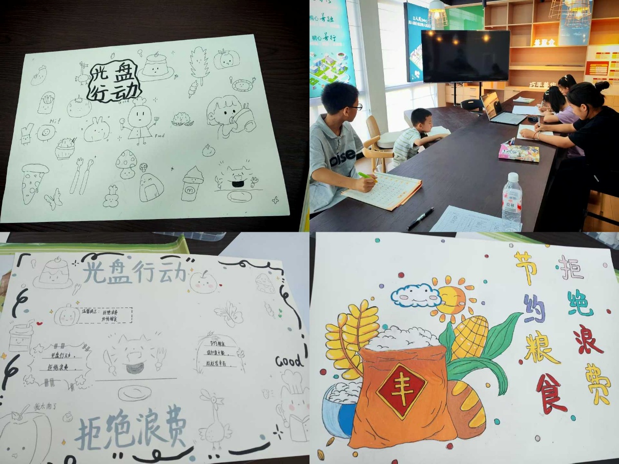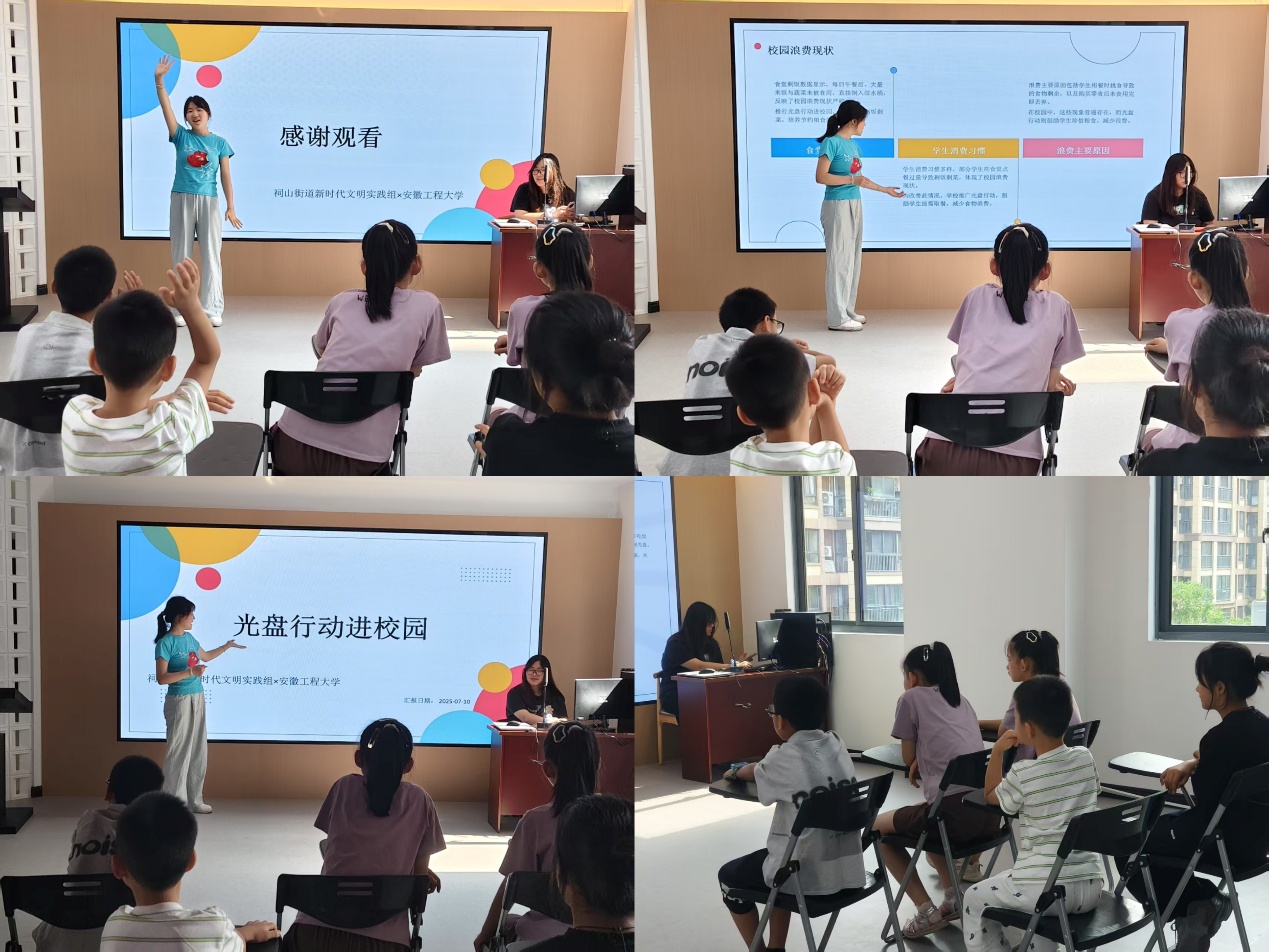 在当地工作人员的带领下和指导教师的指导下,团队来到祠山街道凤凰书屋“七彩课堂”,通过“课业辅导+素质拓展”模式,为辖区内暑期看管有困难的职工子女开展爱心支教活动。在“交通安全,你我同行” 主题宣讲活动中,团队成员用通俗易懂的语言与孩子们讲解互动,通过PPT与播放案例的方式传授交通安全知识,引导孩子们自觉遵守交通法规。在“光盘行动进课堂”主题班会活动中,团队成员通过生动的课件、视频和互动问答的方式,向孩子们讲解粮食的来之不易,并以艺术创作的形式,引导孩子们用画笔表达对“光盘行动”的理解,在童真童趣中传递节约理念。