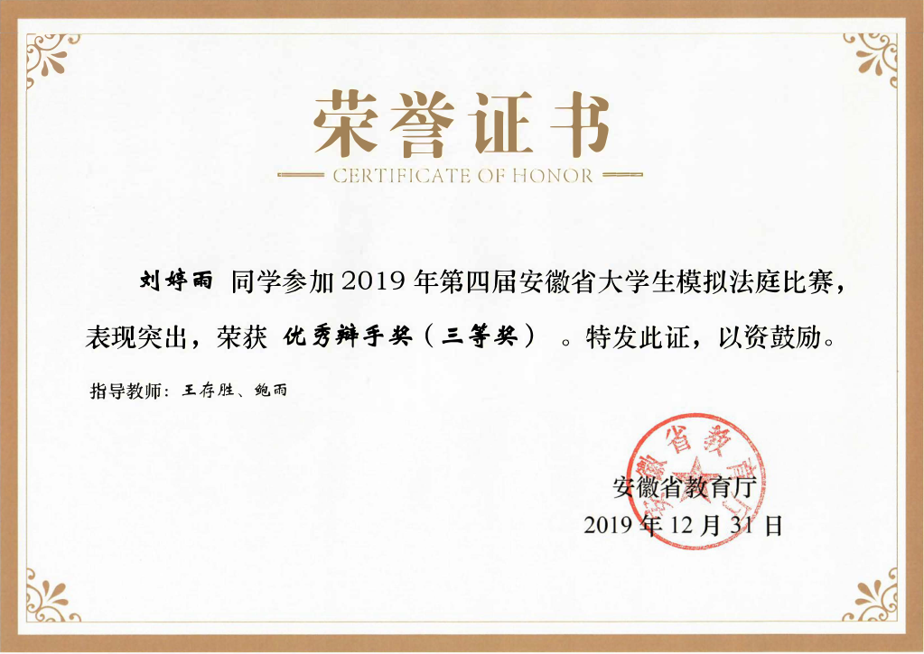 刘婷雨2019年第四届安徽省大学生模拟法庭比赛三等奖