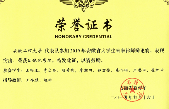 2019年安徽省大学生未来律师辩论赛团体优秀奖