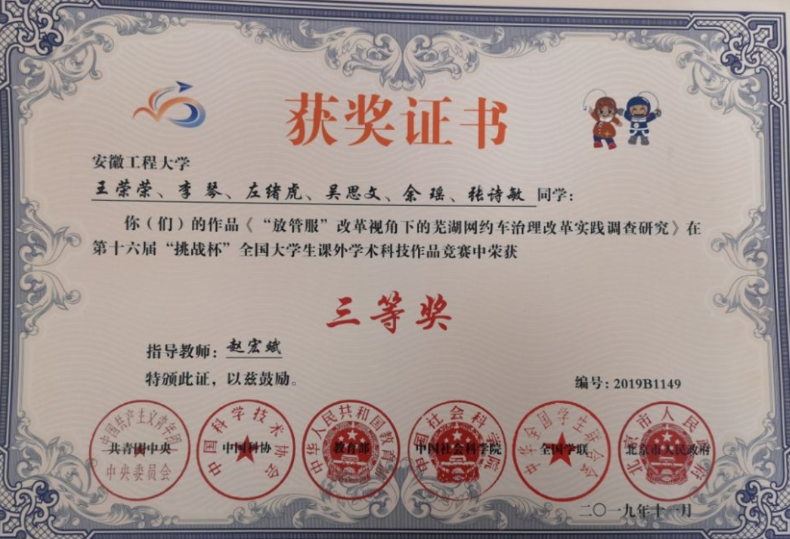 2019年安徽省大学生课外学术科技作品竞赛一等奖