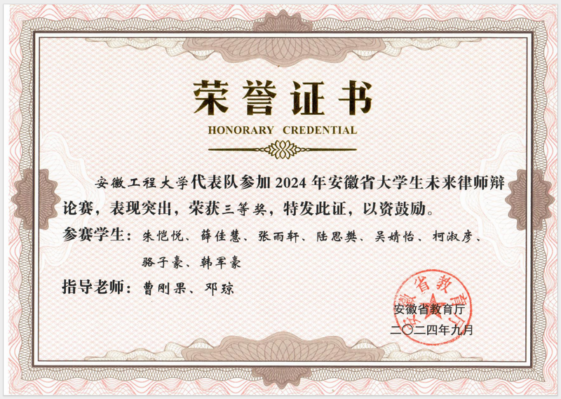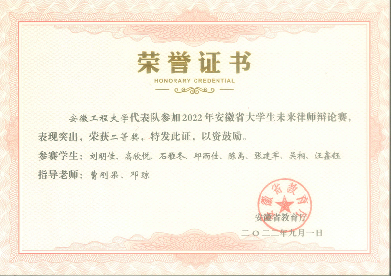 2018年获安徽省大学生未来律师辩论赛团体三等奖