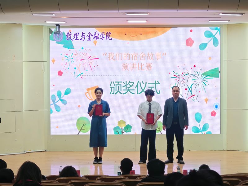 为推动广大同学积极投身宿舍建设,营造和谐的宿舍育人氛围,4月9日,数理与金融学院在学术报告厅举办“我们的宿舍故事”演讲比赛,来自各学院的12名学生入围决赛。马克思主义学院王明、数理与金融学院江政、第一届“我们的宿舍故事”演讲比赛一等奖获得者刘书文担任评委,数理与金融学院党委副书记何志恒、团委书记及200余名学生代表观摩比赛。