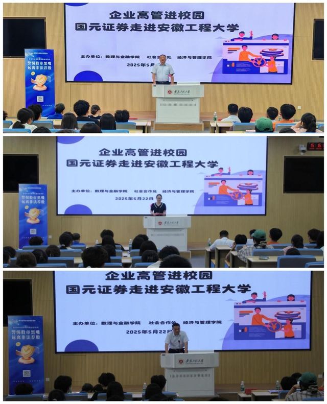 在专题报告环节,国元证券芜湖分公司程雅琦女士作了题为《金融工作者讲证券》的讲座。她结合丰富的从业经验,深入浅出地讲解了证券投资、财富管理等专业知识,并详细介绍了国元证券的业务体系和发展战略,为在场师生提供了宝贵的行业洞见。
