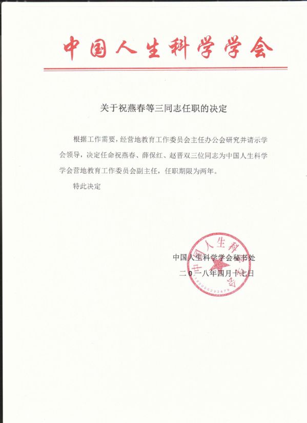 417日,经中国人生科学学会营地教育工作委员会办公会议研究,并报请学会领导批准,聘任我校薛保红博士担任营地教育工作委员会副主任。
