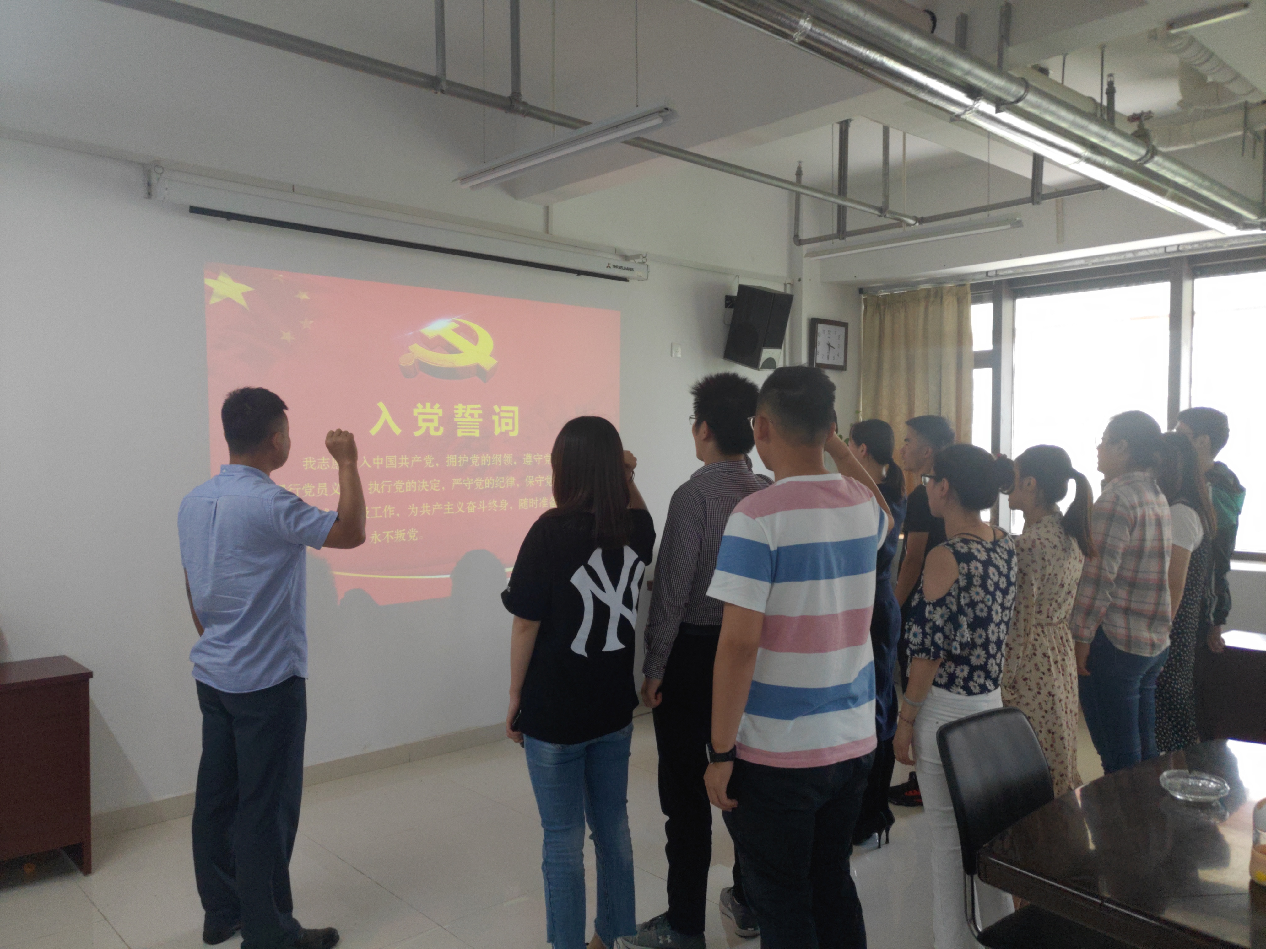 首先,王建老师组织全体党员面对党旗重温入党誓词,提醒同学们不忘初心,坚定理想信念,传承革命精神,并付诸行动于工作生活中。入党宣誓结束后,全体党员再次学习了“习近平总书记在纪念五四运动100周年大会上的讲话”,对“五四精神”、“爱国主义精神”有了更加深刻的了解。