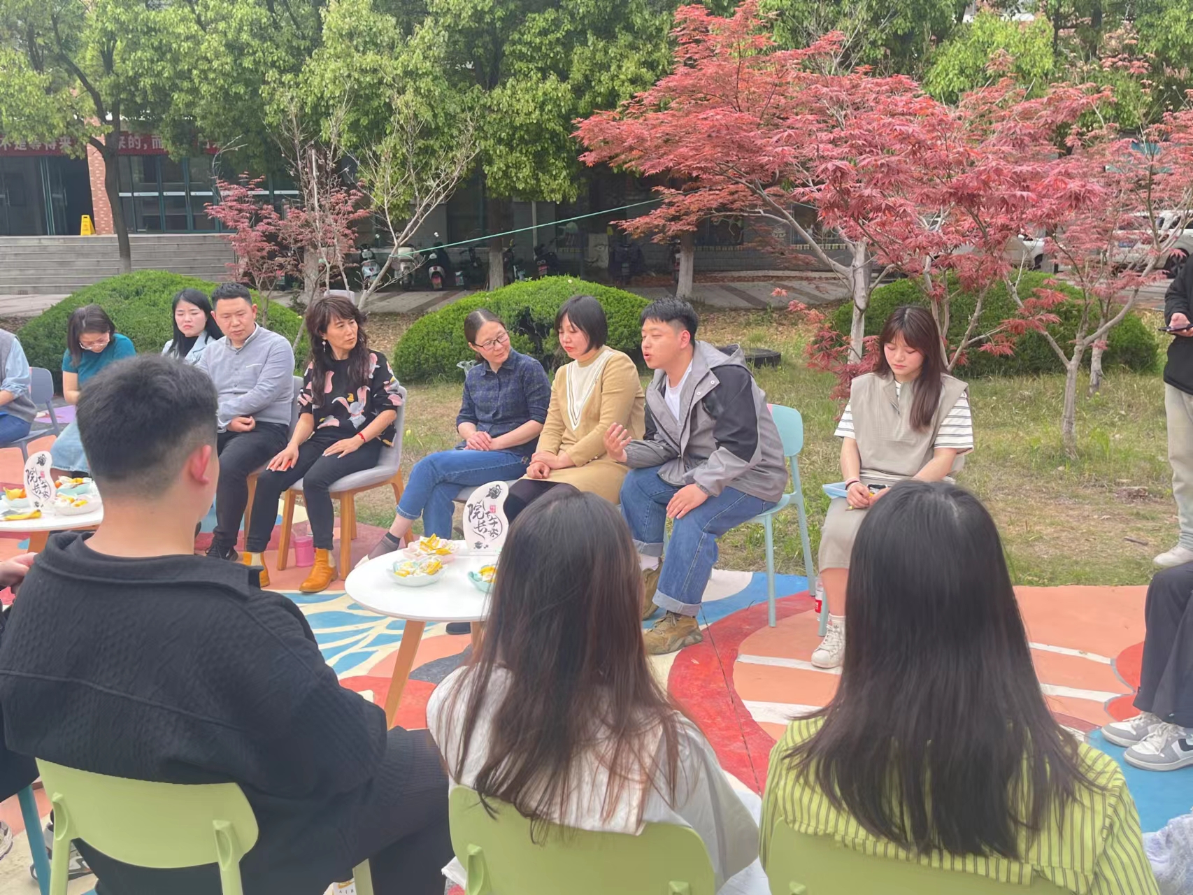 高枝带雨压雕栏,一蒂千花白玉团。在这个春风和煦、花香醉人的午后,设计学院楼前的湖边彩绘打卡地传来热切的讨论声。寻声看去,原来是设计学院在举办院长下午茶。本次下午茶活动由设计学院副院长王小元发起邀请,党委副书记彭海燕,专业教师李响、张翠老师,组织员张焱老师,辅导员姚丽、李荣杰老师,19级就业和考研的毕业生代表张东、张倩茹,以及17位20级学生代表一起围坐畅聊“考研or就业,站在分岔路口的我们如何选择?”的话题。