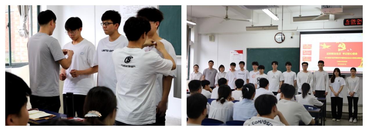 为鼓励新党员赓续优秀党员的光荣传统,会上举行“老党员为新党员佩戴党员徽章”仪式,老党员张焱、袁自坤老师和4名2023届毕业生党员郑重地为新党员佩戴党员徽章,以传递党员的责任意识和担当精神,鞭策新党员坚定信仰、坚守初心,不断加强学习,在习近平新时代中国特色社会主义思想指引下奋力前行。